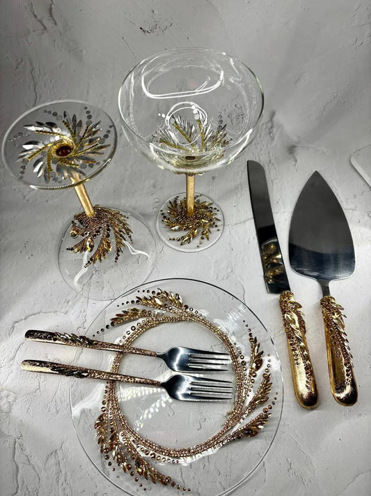 Wedding Martini Glasses, Cake Plate & Forks, Cake Server Set | "Golden Hypnosis"
