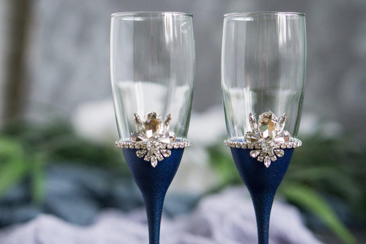 Crystal Navy Toasting Flutes Set of 2 - Engraved Wedding Glasses for Bride and Groom
