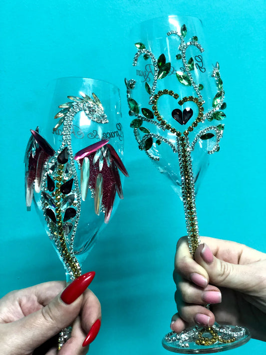Exquisite Emerald and Silver Crystal Wedding Toasting Glasses for Mr. and Mrs.