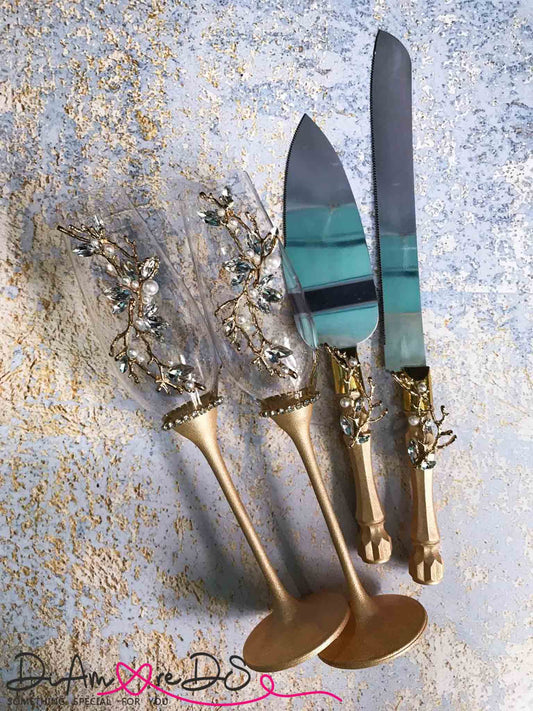 Exquisite Blue Teal and Rose Gold Crystals Luxury Flutes and Cake Cutting Set