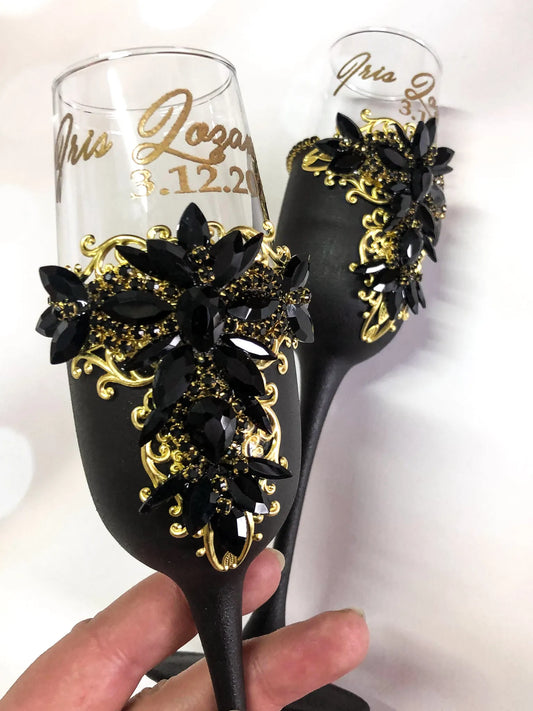 Enchanting Gothic Black and Gold Engraved Champagne Flutes