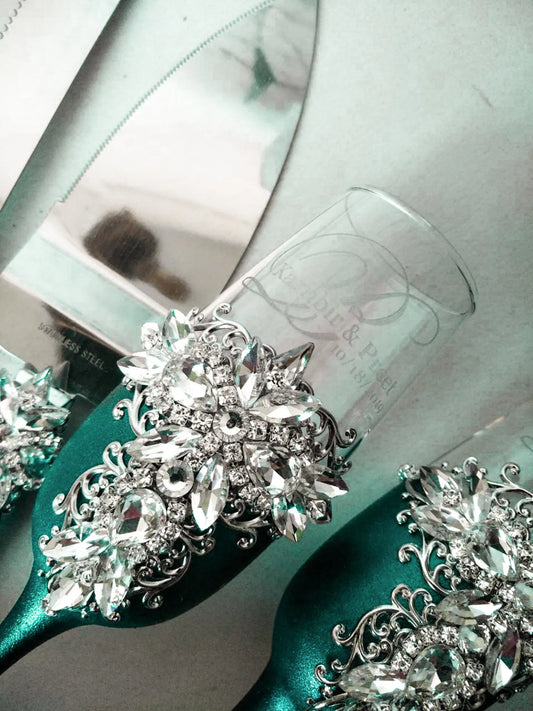 Elegant Emerald and Silver Crystals Flutes and Cake Cutlery Set - Gloria Collection
