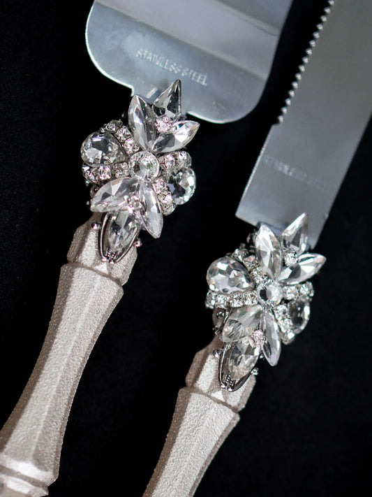 Elegant Ivory and Silver Crystal Wedding Cake Cutting Set - Gloria Collection