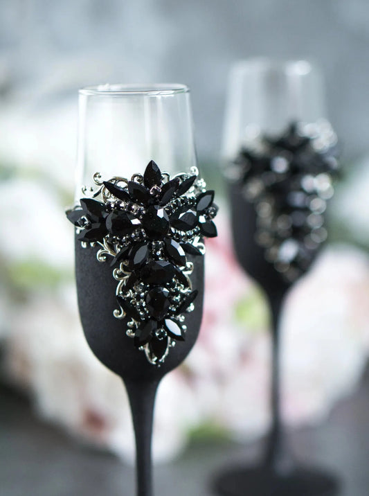 Gloria Gothic Black and Silver Personalized Wedding Toast Champagne Flutes for the Darkly Enchanted Bride and Groom