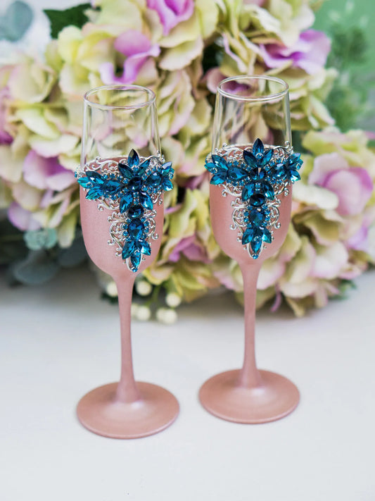 Gloria Blue Teal and Rose Gold Wedding Flutes for the Bride and Groom