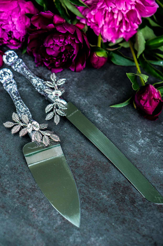 Silver Wedding Cake Cutting Set and Plate with Forks | Aurora Collection