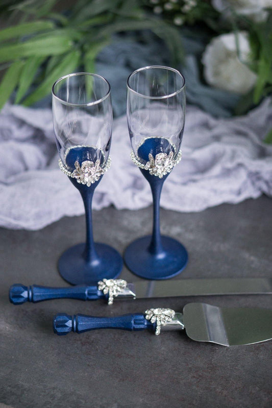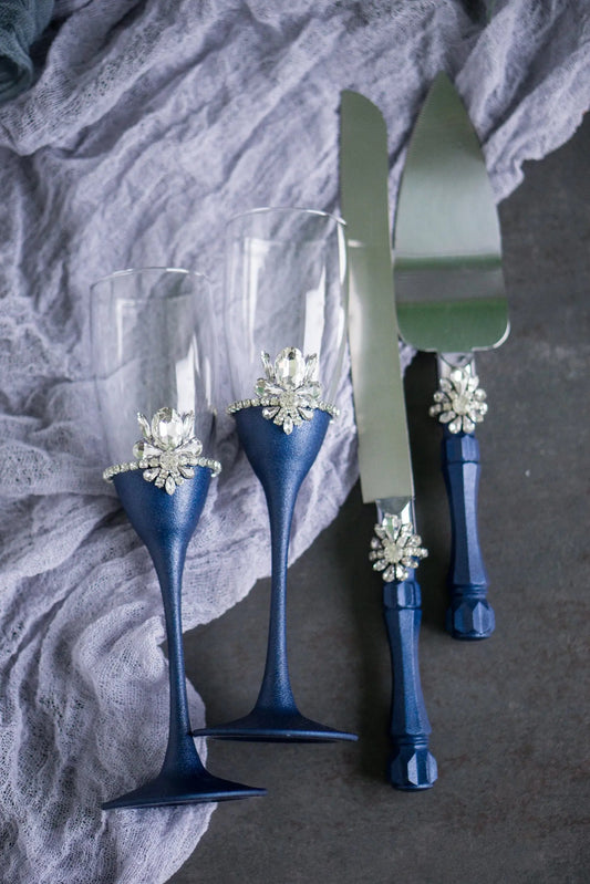 Elegant Navy Blue Personalized Wedding Flutes and Cake Server Set - Amanda Collection