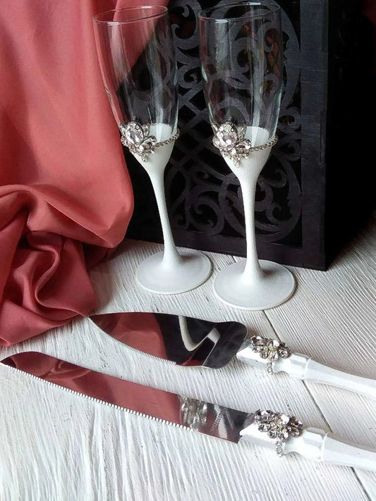 Personalized White and Silver Wedding Flutes and Cake Server Set - Amanda Collection