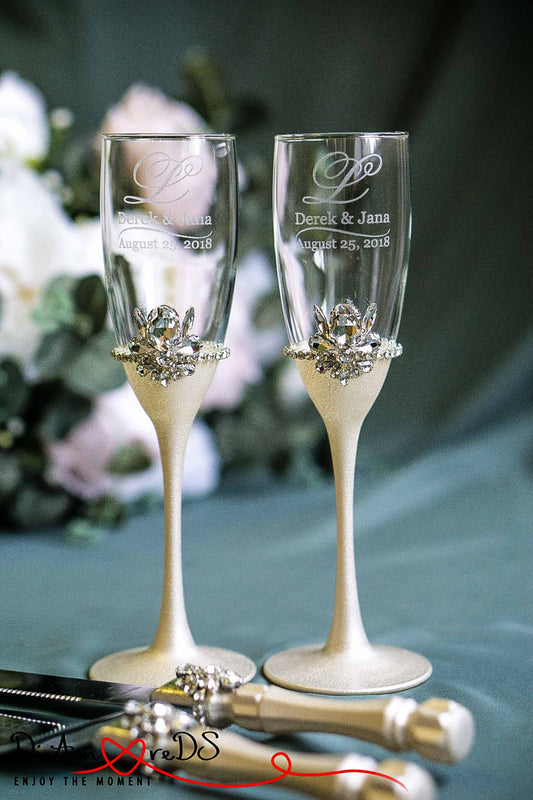 Personalized Ivory Wedding Toasting Flutes and Cake Serving Set - Amanda Collection