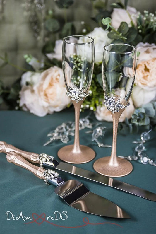 Personalized Rose Gold Wedding Champagne Flutes and Cake Server Set - Amanda Collection