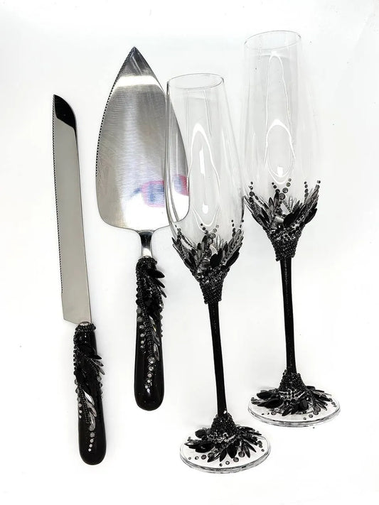 Black Crystals Gothic Themed Wedding Champagne Glasses and Cake Cutting Set