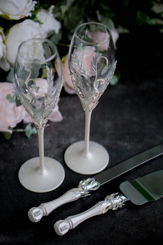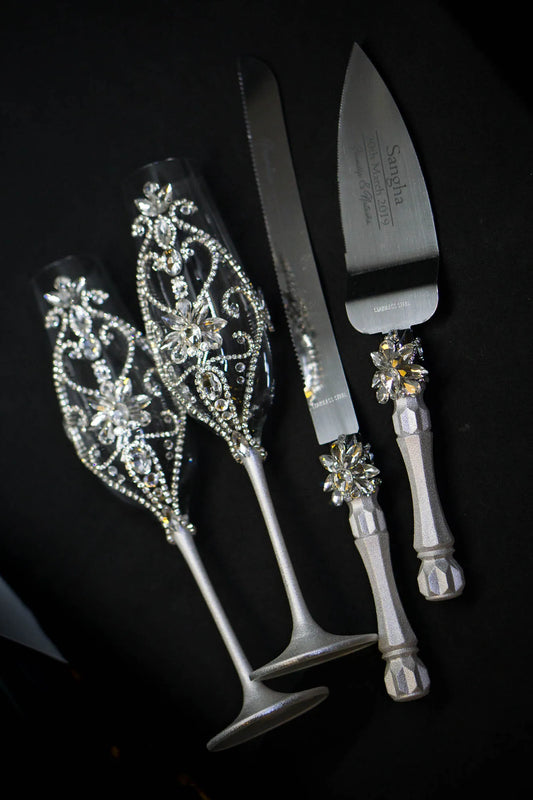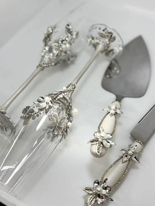 Champagne Glasses and Wedding Cake Cutting Set | "Silver flowers"