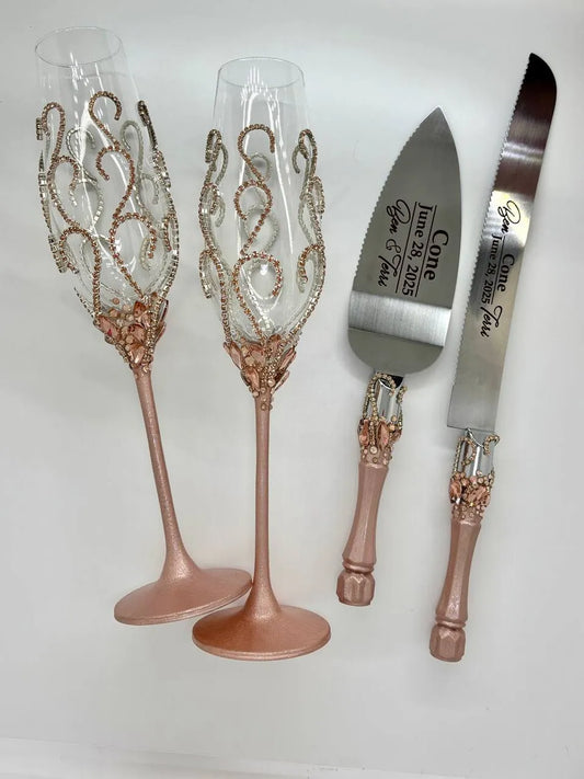 Rose Gold Wedding Champagne Glasses and Engraved Cake Server | Venice