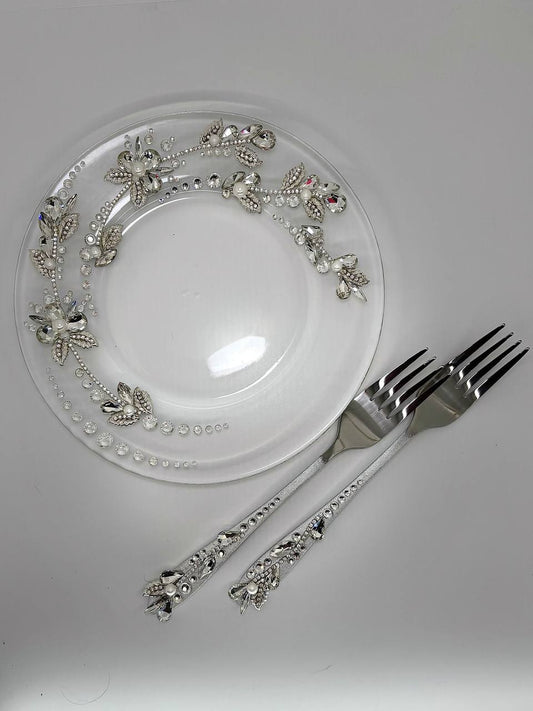 Wedding Cake Plate and Fork Set | "Silver flowers"