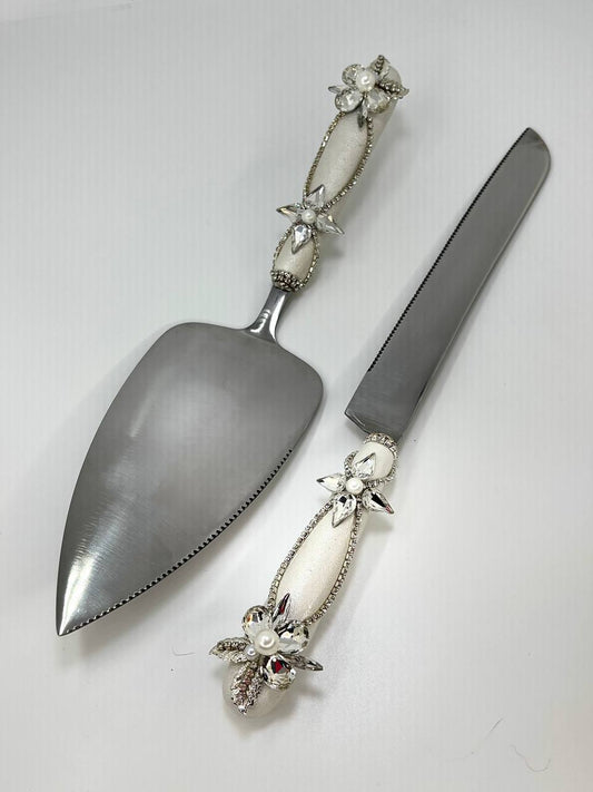 Champagne Glasses and Wedding Cake Cutting Set | "Silver flowers"