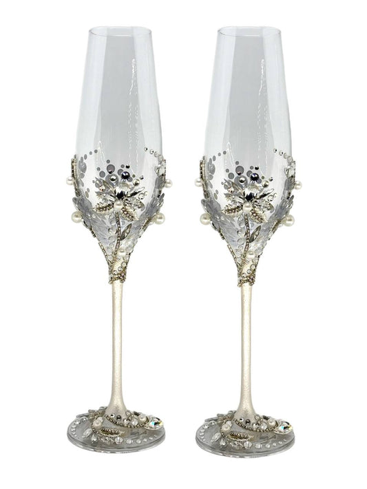 Personalized Wedding Champagne Glasses | "Silver flowers"