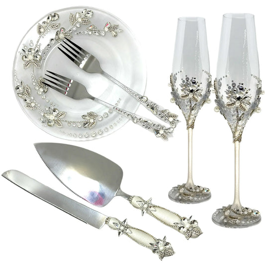 Wedding Flutes, Cake Plate & Forks, Cake Server Set | "Silver flowers"