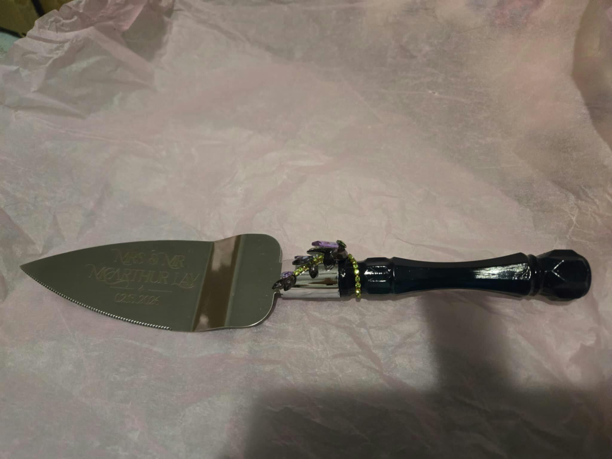 💎 Crafted with attention to detail and high-quality materials. Celebrate your special occasion our exquisite toasting flutes and cake server set adorned with lavender sprigs, made from light violet and violet crystals and green-gold chains, creating an atmosphere of elegance and romance.